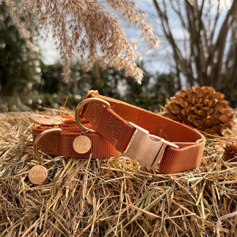 Il Collare Honey Drift combina nylon color miele-cognac con finiture dorate, offrendo stile e resistenza. Il materiale anti-sfilacciamento e la chiusura sicura garantiscono comfort e una vestibilità stabile, ideale per l’uso quotidiano o le avventure all’aperto. Personalizzalo con targhette, ricami o pin per riflettere la personalità del tuo cane.