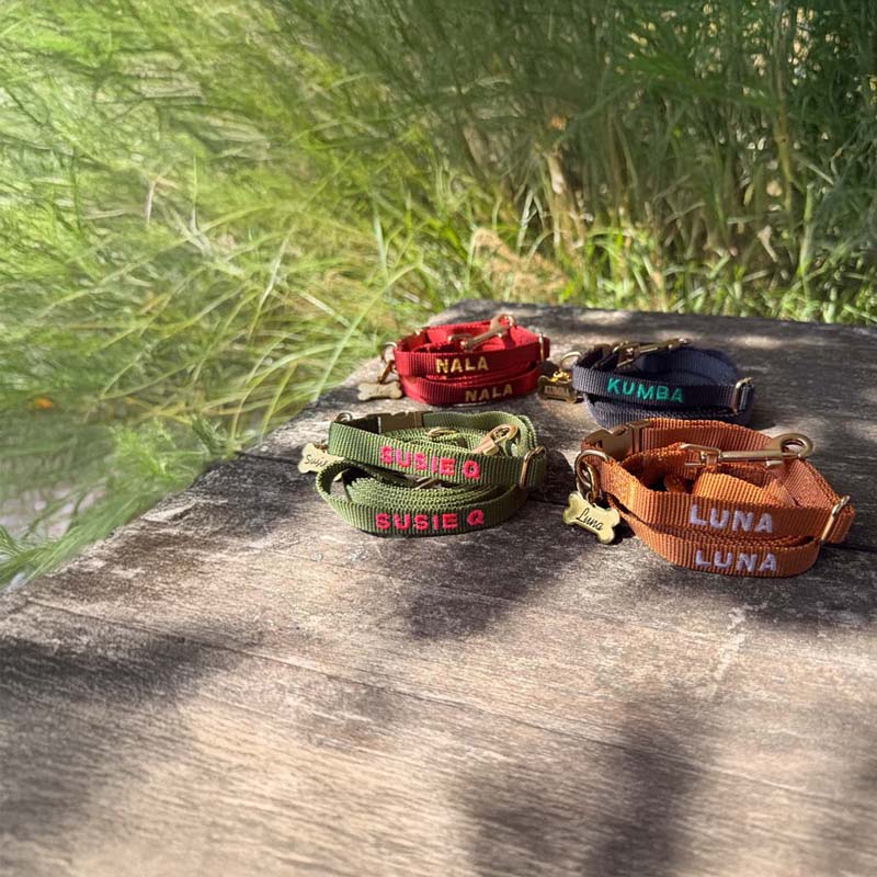 Each collar is stitched by us on sturdy, flexible nylon, so a tiny wiggle or slightly off-straight letters can happen.