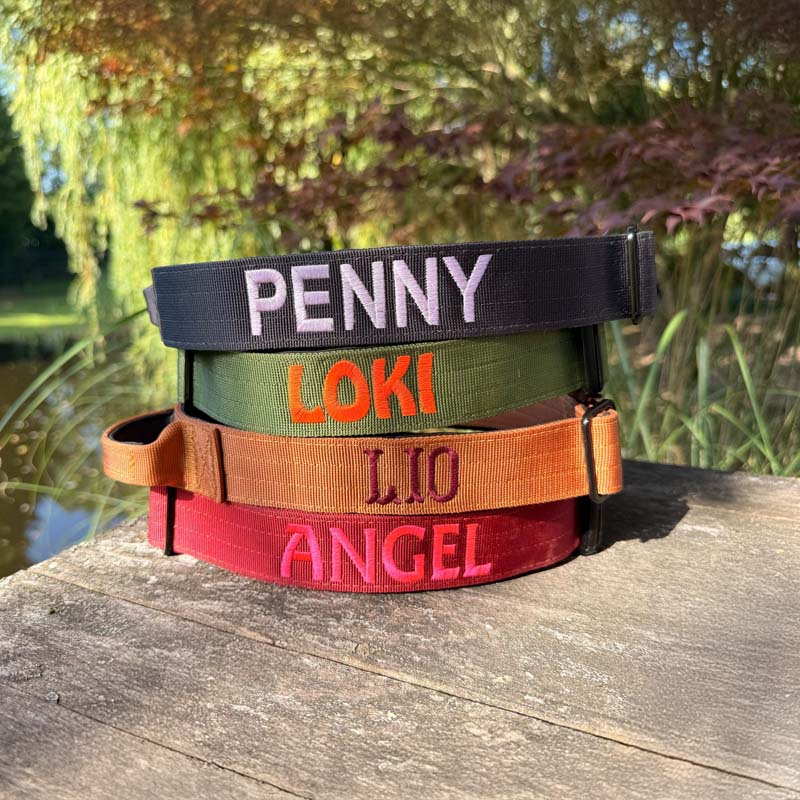 Each collar is stitched by us on sturdy, flexible nylon, so a tiny wiggle or slightly off-straight letters can happen.